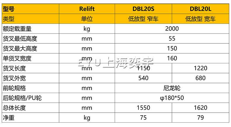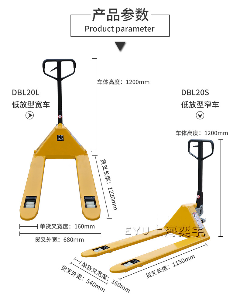 ● EY-HPL20型適用于托盤叉口離地高度小于60mm的托盤的搬運