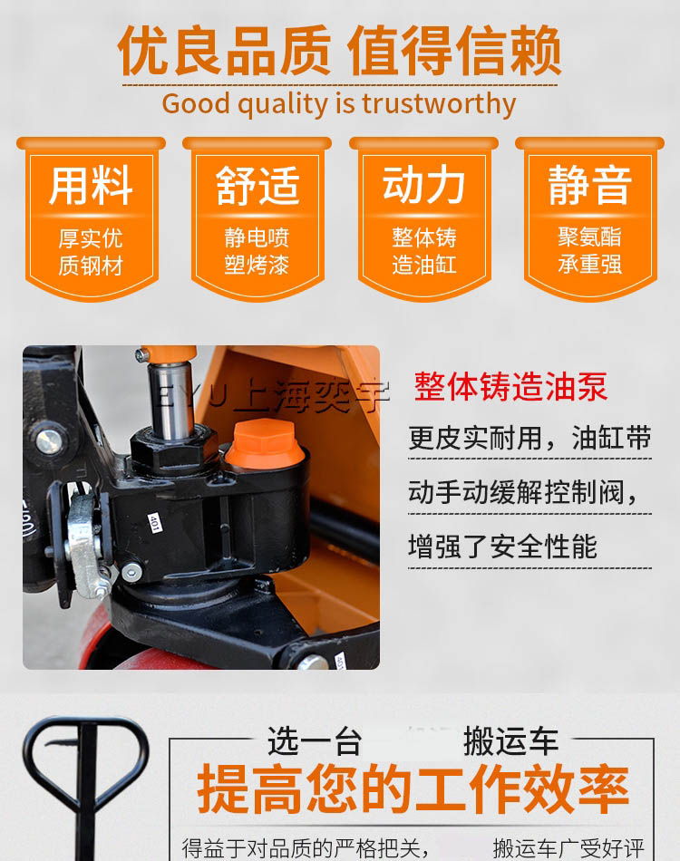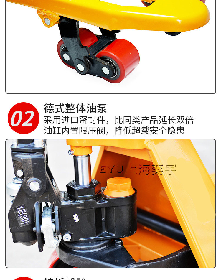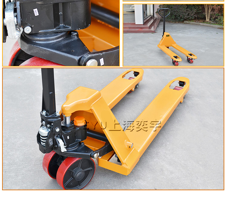 ● 一體式鑄造輪架.配置雙前輪.承載能力強.并裝有前后導向輪.保護前輪免受撞擊.延長輪子使用壽命