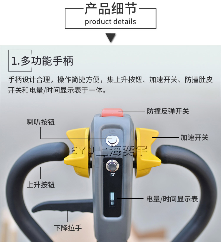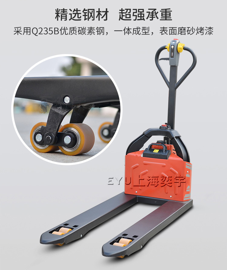 EY-EPT12輕型鋰電池搬運(yùn)車,額定載重1200kg,配備24v20Ah免維護(hù)鋰電池,電動升降,電動行走。
