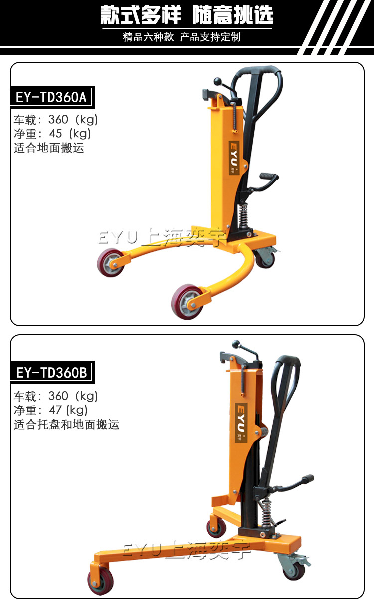 A型可以上磅稱,磅稱深度550mm,適合磅稱寬度680mm,高度180mm;B款可進(jìn)入托盤深度600mm,適用托盤寬度920mm,