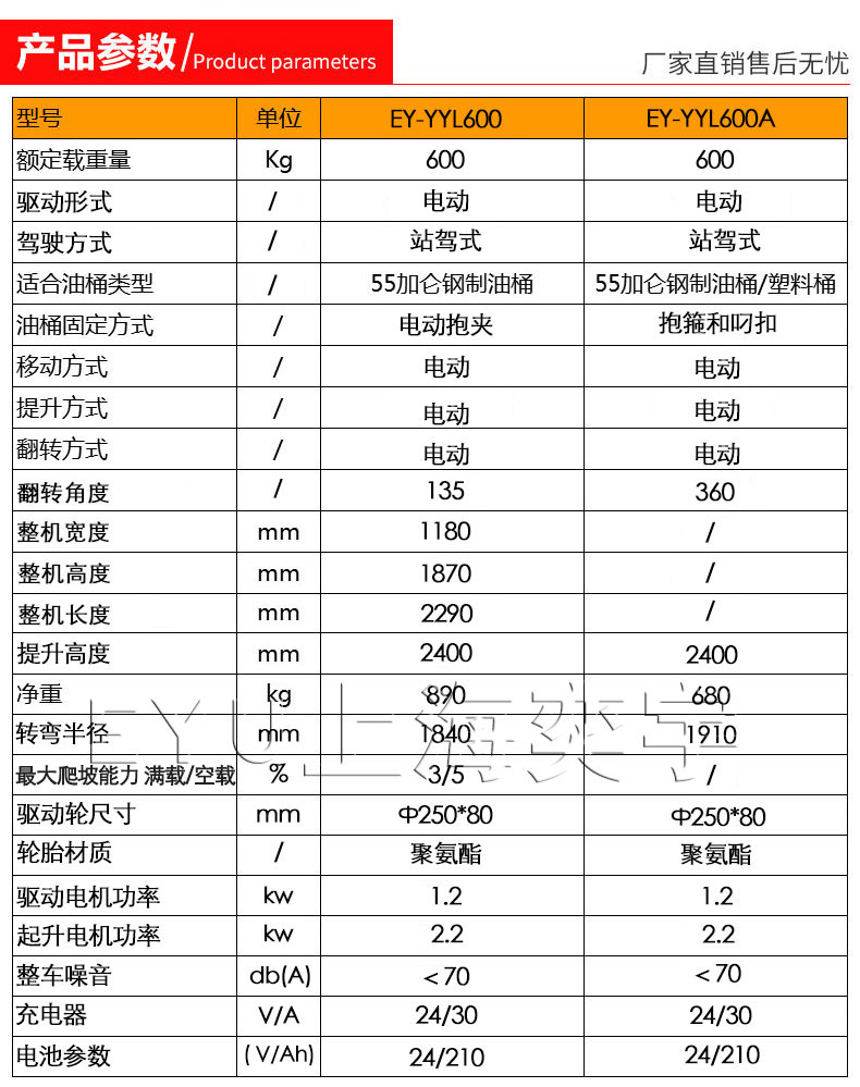 EY-YYL600全電動油桶翻轉(zhuǎn)車詳細(xì)參數(shù):