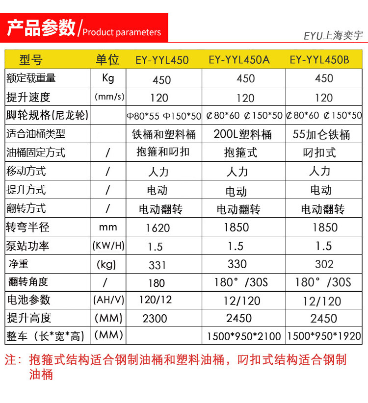EY-YYL450鐵桶用電動倒桶車2節(jié)門架詳細(xì)參數(shù):