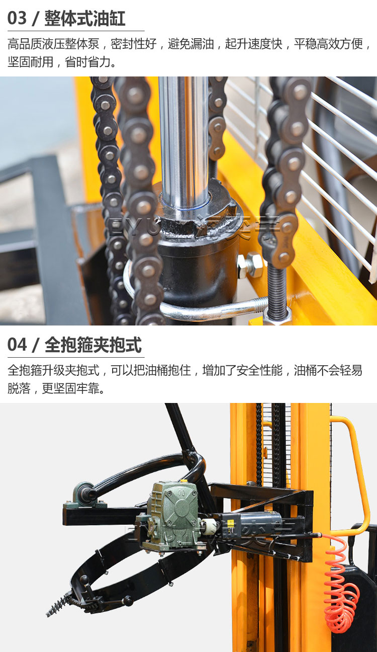 3.抱箍式與叼扣式一體,適合鋼制油桶和塑料油桶電動翻轉(zhuǎn)