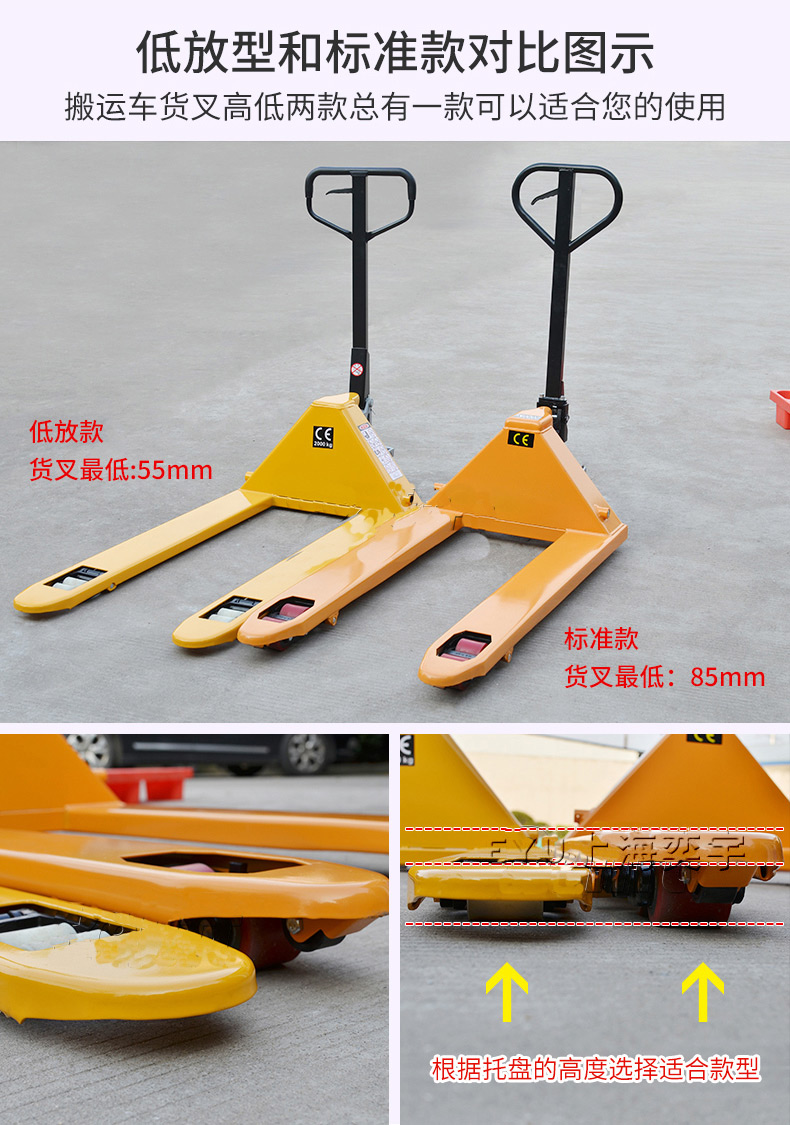 EY-HPL超低放型手動液壓搬運車,額定載重1噸和2噸,*低高度是36mm和55mm;