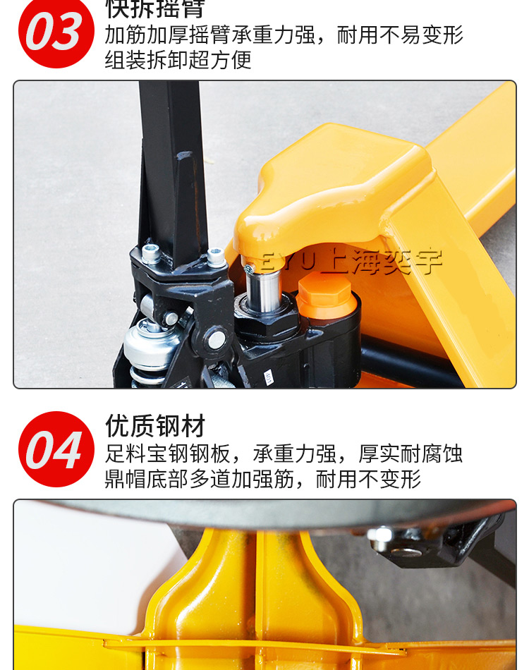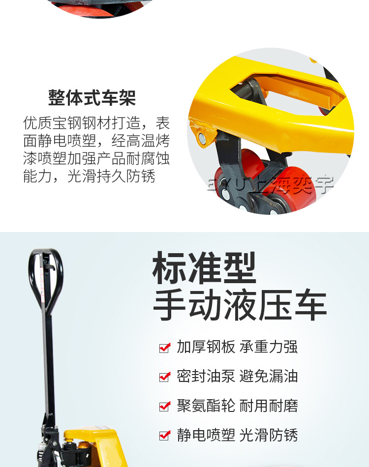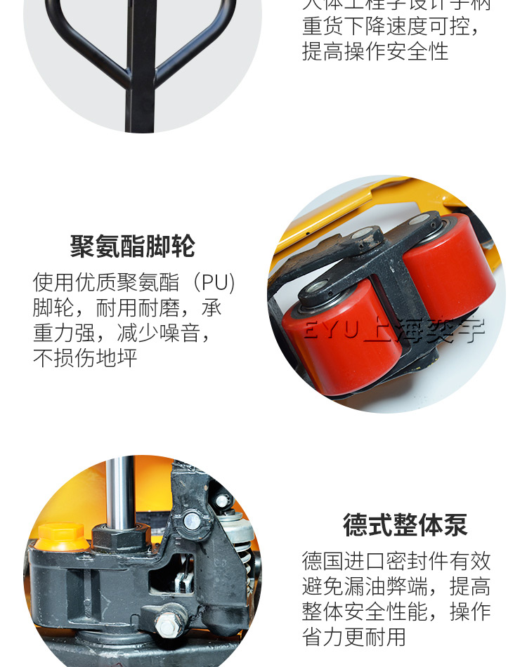 ● 一體式鑄造輪架.配置雙前輪.承載能力強.并裝有前后導向輪.保護前輪免受撞擊.延長輪子使用壽命