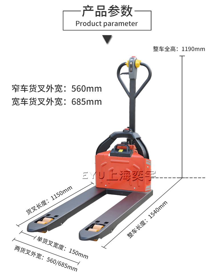 EY-EPT12輕型鋰電池搬運(yùn)車,額定載重1200kg,配備24v20Ah免維護(hù)鋰電池,電動升降,電動行走。