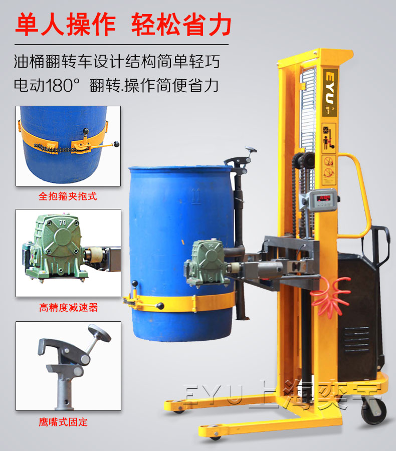 5.抱箍式與叼扣式一體,適合鋼制油桶和塑料油桶電動翻轉(zhuǎn)。