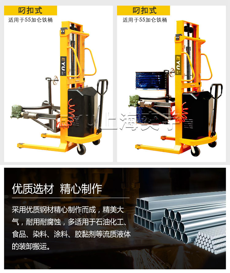 1.選用優(yōu)質(zhì)液壓泵站,動力強勁,免維護電池,電力持久。2.油桶翻轉(zhuǎn)車設(shè)計結(jié)構(gòu)簡單輕巧,抱箍式結(jié)構(gòu)適合鋼制油桶和塑料油桶,叼扣式結(jié)構(gòu)適合鋼制油桶,操作簡便省力。3.適用于化工、食品車間、染料、涂料、膠黏劑、石油、食油等流質(zhì)、液體的搬運,裝卸、倒料等使用。4.抱箍式與叨扣式一體,電動翻轉(zhuǎn)。